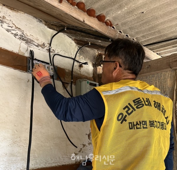 마산면 우리동네 복지기동대가 지난 9월18일 노후 전선 및 전기 누전으로 생활에 불편을 겪는 가구에 재능기부 봉사를 추진했다. 대상 가구는 홀로 지내는 저소득 독거어르신으로 복지기동대가 노후주택 화재예방 안전 점검 차 들렀다가 노후된 전선 전체와 누전차단기를 교체하는 등 전기설비 안전점검 및 개보수 활동을 전개했다.
