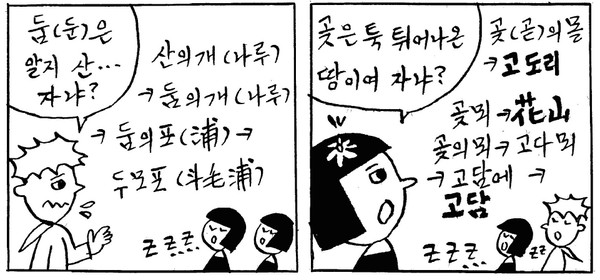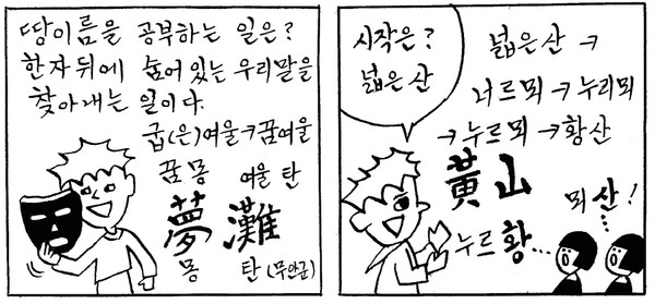 ▲황산(黃山) : 넓은 산이라는 뜻이다. 너르메(넓은 산)가 누르메(누른 산)로 들리어 누를 황(黃)의 황산(黃山)이 된 것이다. 육군 훈련소가 있는 충청남도의 논산(論山)도 황산벌의 황산(黃山)에서 유래했다. ‘너르메’에서 ‘너르’는 발음이 비슷한 ‘논(論)’으로 표시하고, 뒤의 ‘메’는 ‘뫼’ 산(山)으로 뜻을 가져온 것이다.