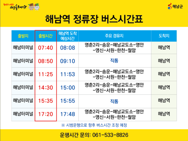 특히 해남터미널에서 해남역까지 소요시간이 약 30분인 점을 고려해 직통운행(해남역-해남터미널)과 직행운행(각 마을 경유)으로 교대 운행해 효율성을 높였다.