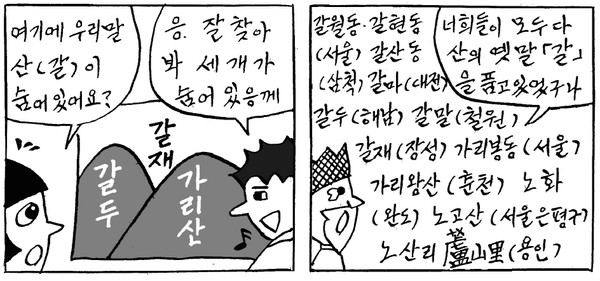 ▲갈두 : 산이 머리를 들었다는 의미. 산의 옛말 ‘갈’과 ‘머리’ 두(頭)가 합해진 단어다. 산마을>갈말>갈마리>갈머리로 되고 ‘갈’은 칡 갈(葛)의 음을 가져오고 ‘머리’는 뜻을 빌어 두(頭)를 쓴 것이다. 부연하면 백두산(白頭山)과 곤륜산(崑崙山)의 맥을 이어온 곳이 해남 두륜산(頭輪山)이고 그 지맥이 남쪽으로 달려가다가 머리를 치켜들고 기운을 뭉친 곳이 땅끝 갈두산(葛頭山)이다. 땅끝에서 한양까지 1천리, 한양에서 함경북도 온성까지 2천리다. 이렇게 해서 반도 3천리가 된다. 갈두산 사자봉은 한반도 삼천리 금수강산이 시작되는 첫 머리다.