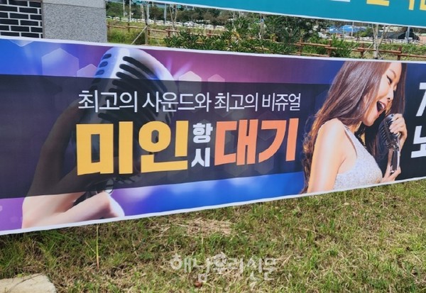 북평면 남창리에 걸린 해남읍 노래방 홍보 현수막이 눈살을 찌푸리게 만든다. 청소년과 지역민들이 오가는 거리에 ‘미인 항시 대기’라니 심하지 않는가. (사진 : 독자 제보)