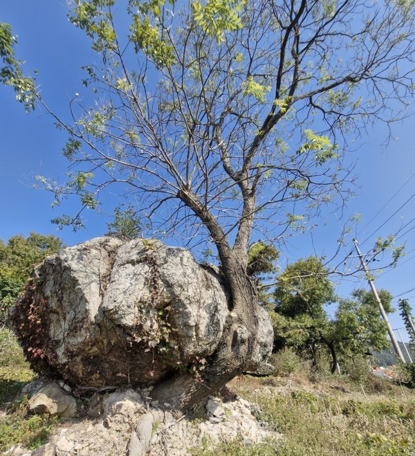 억겁의 세월을 품는 고인돌의 뼈와 살이 된 나무, 둘은 고통을 넘어 공생을 택했다. 현산면 학의마을 입구 고인돌군락지. 이곳 고인돌은 마을 역사보다 훨씬 긴 3000년의 시간을 품고 있다. 3000년 역사의 둥지에 몰래 눌러앉은 나무. 시간의 무게감만큼이나, 고인돌의 무게감만큼이나 공생의 우정도 깊어지고 있다.