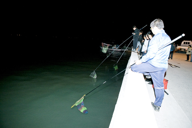 이색 뜰채 낙지잡이는 뜰채만 있으면 누구나 할 수 있다. 들물에 불빛을 따라 제방으로 밀려오는 낙지를 뜰채로 걷어 올리기만 하면 된다.