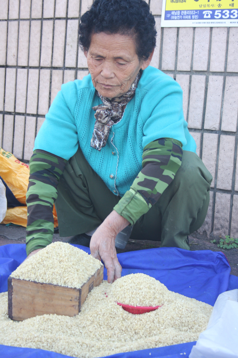 지난 6일 읍 삼성생명 앞에서 만난 김모 할머니. 김 할머니는 바다에서 막 잡아온 각종 수산물과 함께 찐쌀을 판매하고 있었다.