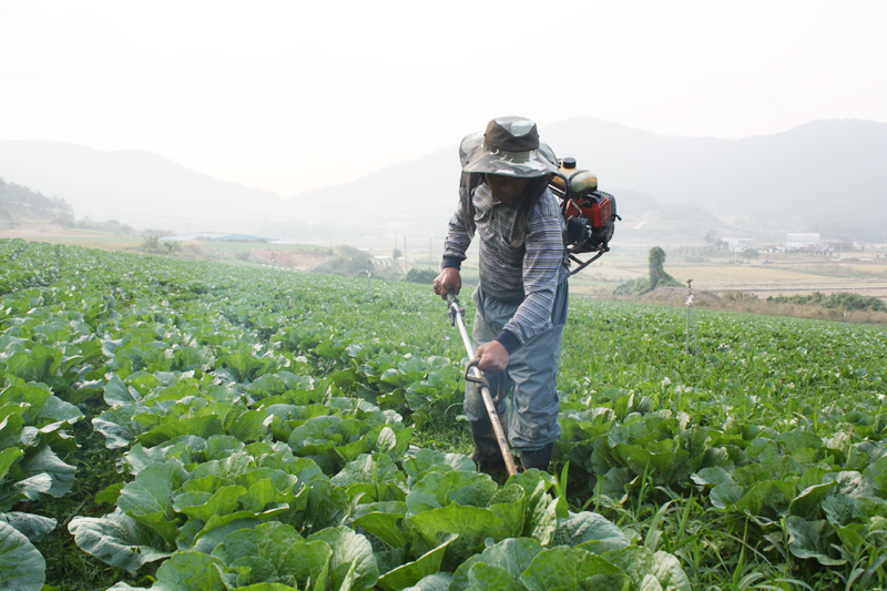 친환경 농법은 풀과의 전쟁이라고 했던가. 지금 월산 마을 배추밭에는 고랑에 자란 잡초를 제거하는 예초기 소리가 드높다.