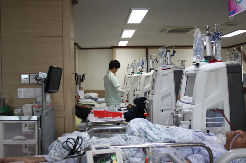 해남종합병원은 서관 2층에 있던 23대 규모의 혈액투석실을 30대로 확장하고 동관 1층으로 지난 12일 이전했다. 최신기계 시설을 갖춘 혈액투석실은 보호자의 편의를 위해 휴게실을 따로 두고 휴게실 내에 안마의자 등을 비치했다. 현재 종합병원 혈액투석실은 완도와 진도 강진 해남 등 70여명의 환자들이 이용하고 있는데 월수금은 오전 6시부터 오후 6시까지, 화목토는 오전 6시부터 오후 2시까지 운영하고 있다. 김희중 기자/