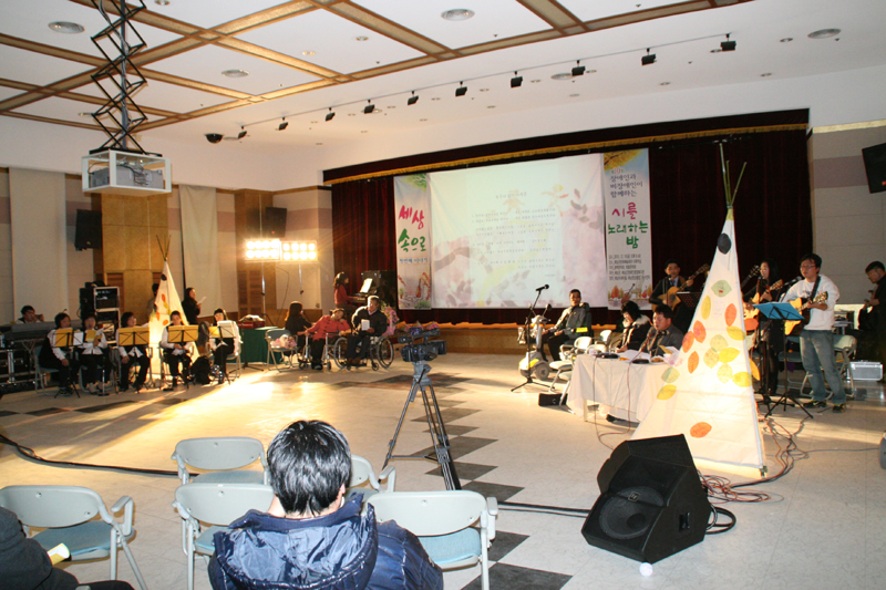 장애인 문학동아리 동백문학회가 올해로 장애인과 함께하는 시노래의 밤 10주년 행사를 개최했다. 지난 12일 치러진 이 행사는 해남에서 처음 시도되는 라디오식 진행으로 이동이 불편한 장애인들을 위해 최대한 동선을 없애고 지정된 자리에서 시낭송과 노래공연을 펼쳤다.