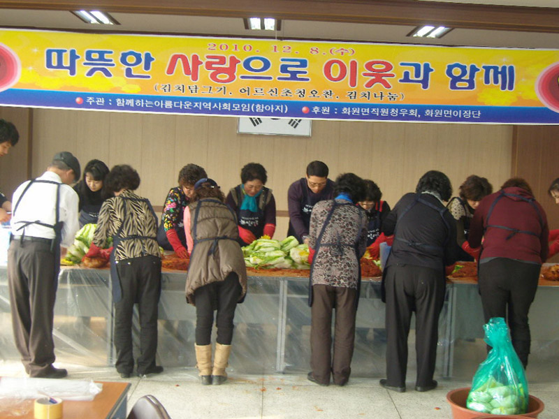 ‘함께 하는 아름다운 지역사회 모임’(약칭 함아지회)이 주관하고 뜻을 공감하는 화원면이장단과 화원농협, 면사무소 직원 등이 성금을 모아 김치나눔 행사를 개최했다.