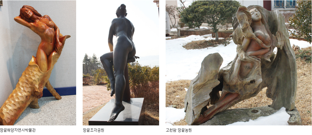 해남에서도 여체 조각상들을 만날 수 있습니다. 땅끝조각공원에 있는 작품 대부분이 여체 조각상입니다. 이곳의 여체 작품들은 너무도 사실적이라는 비판을 받습니다. 그러나 정면상이 아닌 측면 또는 뒷면에서 바라보면 또 다른 맛을 느낄 수 있는 작품들입니다. 특히 뒷면에서 바라보면 엉덩이를 중심으로 한 단단한 근육이 여체를 더욱 풍만하게 만들고 관람자에게 팽팽한 긴장감마저 안겨줍니다.