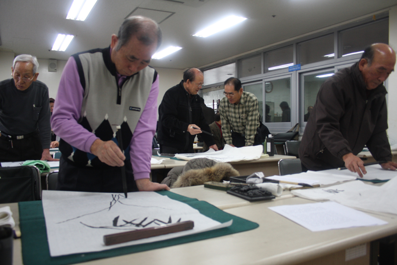 매주 월요일과 수요일 오전 10시부터 12시까지 2시간의 강좌 시간. 노인들만의 여유와 유머가 가득하다. 서로간의 작품을 비교하며 칭찬이 이어지고 “자네 하산해도 되겠네”, “밥은 빌어먹고 살수 있겠네”라며 애정 어린 농담이 오간다.