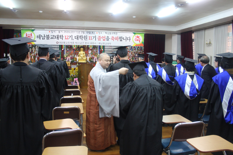 이번 불교대학 졸업식은 불교입문과 금강경, 법화경, 천수경, 반야심경을 공부한 대학과정 12기 45명과 대학원과정 11기 14명이 졸업했으며 품계식과 졸업증서, 휘장 수여 순으로 이어졌다.