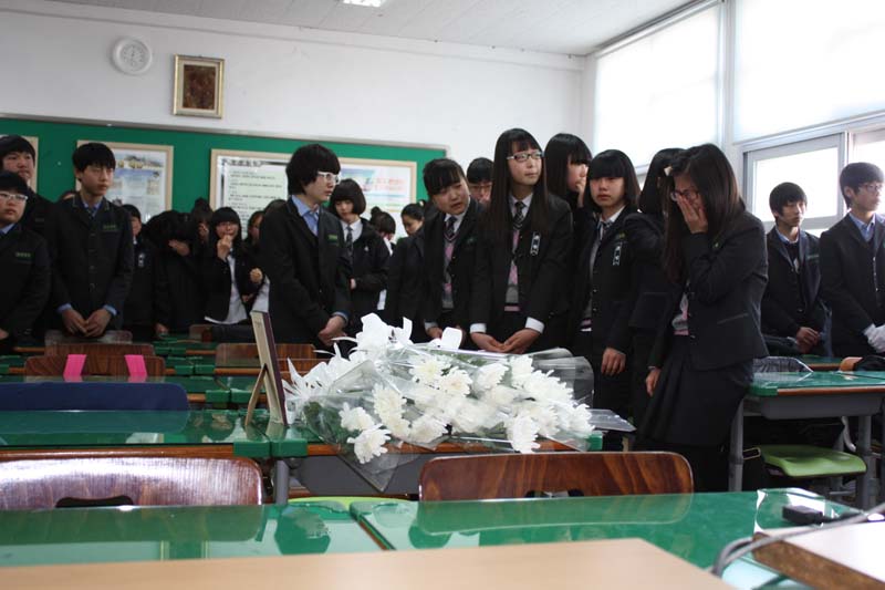 정문 옆에 차려진 빈소에서 가족과 교사, 급우들의 헌화가 이어졌다. 침묵만이 교정을 내리누른다. 도열한 학생들 속에서는 계속 흐느낌이 이어졌다.