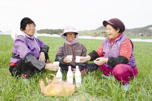 지난 26일 황산 송호리에서 밀밭을 매다 쉴참으로 막걸리를 마시던 강정엽(75), 임정엽(74), 한정임(55)씨는 “더울 때 소주는 안 좋다. 땀 흘리고 일할 때 막걸리만한 술이 없다”며 막걸리 예찬론을 폈다.