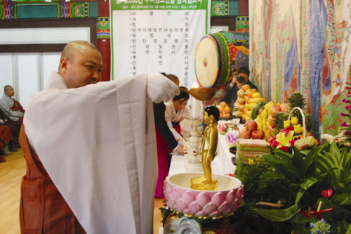 이번 법요식은 명고(鳴鼓)와 명종(鳴鐘) 의식을 시작으로 향·등·꽃·과일·차·쌀 등 여섯 가지 공양물을 부처님 앞에 올리는 육법공양과 불(佛)·법(法)·승(僧) 삼보(三寶)에 예를 갖추는 삼귀의, 자신의 몸과 마음을 청정히 하는 의미인 관불의식 등으로 이어졌다.