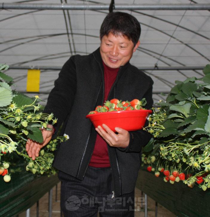 공중에서 딸기가 주렁주렁 달리는 곳이 있다. 옥천 신죽마을 정천운씨가 재배하는 1200평 딸기하우스에선 넝쿨을 뻗어가는 포도처럼 허리 높이에서 딸기가 열린다. 정씨는“양액으로 재배하기 때문에 저장성이 좋고, 흙에 닿지 않아 깨끗하며, 햇빛을 고루 받아 당도가 높고 균일한 것이 장점”이라고 말했다.