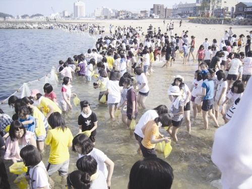 오징어를 수산물 시장에서 사와 해안가에 가두리를 만들어 오징어를 풀고 체험객들이 직접 바다에 들어가 맨손으로 오징어를 잡게 하고 있다.