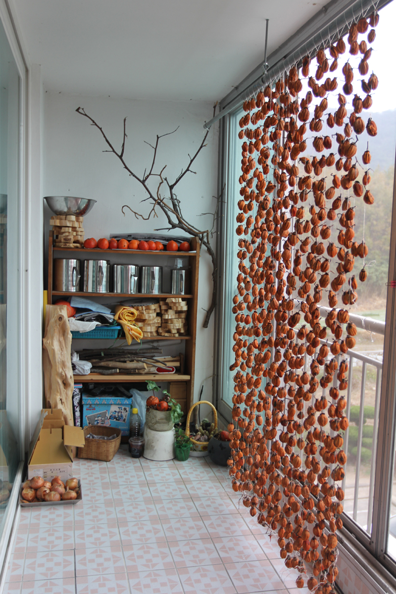 새시대 아파트 베란다에 걸린 곶감, 노란 커튼이 되었다. 이의영 교사(북평상고)는 광주 사시는 친정아버지가 산에서 따다 보내준 산감을 곶감으로 만들어 베란다에 주렁주렁 매달아 놓았다. 궁금하면 가족들 누구나 베란다에 나가 곶감 빼먹듯이 하나둘 곶감을 빼 먹는단다. 박영자 기자/