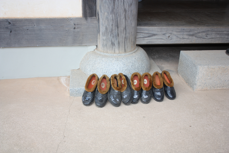 주인은 동안거에 들었을까? 우리 이렇게 꼭 붙어 있으면 더 따뜻하겠지? 다소곳이 서로 기댄 네 켤레의 털신이 다정하기만 하다. 새해가 시작된 지난 2일 미황사의 털신들이 해바라기를 하고 있다. 박태정 기자/