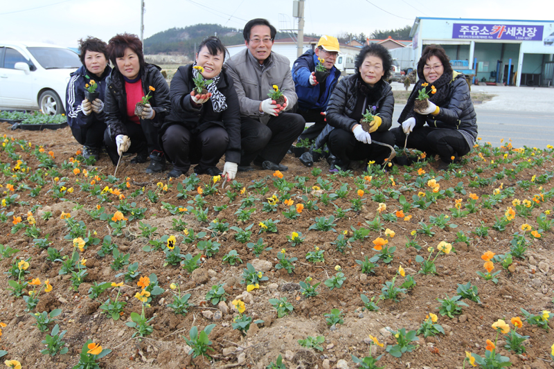황산면 6명의 여성이장들이 꽃피는 황산을 만들기 위해 지난 12일 황산면(면장 강형식) 관두리 도로섬에 노랑과 보라색 꽃이 활작 피어난 팬지꽃을 심어 한겨울 봄을 연상케 했다. 원호리 명시정 이정은 아름다운 황산면을 만드는데 여성이장들이 힘을 보태자고해 꽃동산을 조성하게 됐다고 말했다.