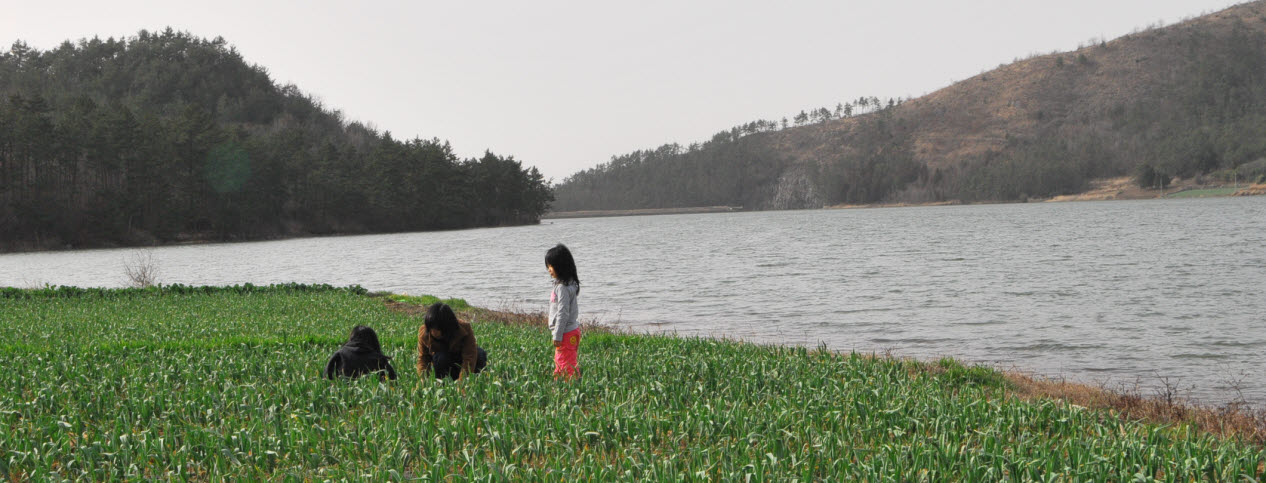 마을 앞에 시원하게 펼쳐진 파란 저수지와 초록 마늘밭이 싱그럽기만 하다. 연일 이어진 꽃샘추위가 잠시 자취를 감추자 해남읍에서 할머니 집에 놀려온 윤영록(군청 홍보계 근무)씨 가족이 봄볕을 쬐며 마늘밭에서 시금치를 캐고 있다.<송지 신기리>