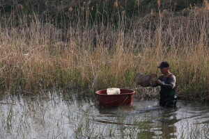 일주일 1회 미꾸라지를 잡는 날은 새벽 6시에 논두렁에 도착한다. 그때부터 해가 질 때까지 그는 종일 물속에서 생활한다. 늦은 오후 힘이 드는지 그의 표정이 지쳐 보인다. 힘들게 얻는 수확, 그러나 보람도 크다.
