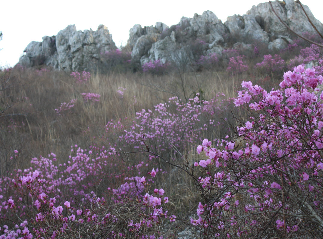 주작산이 붉은 진달래로 물이 들었다. 표고가 높아 평지에 비해 개화시기가 느린 주작산 질달래는 골산인 주작산에 연분홍 활력을 불어넣고 있다. 아직 50%의 개화를 보이고 있어 이번 주말과 다음주말 사이에 두견새의 피울음 같은 진달래의 아우성을 볼 수 있다.박태정 기자/