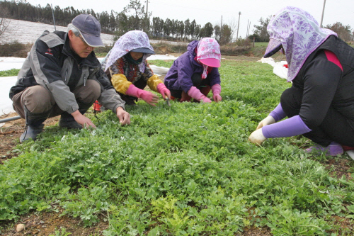 마산면 금자리 2000여평의 쑥 재배 농장, 겨울한파를 이기기 위해 씌운 부직포를 걷어내자 파릇파릇한 쑥이 탐스럽게 모습을 드러낸다. 쑥 재배농장 주인은 해남읍 박상일 씨, 올해 첫 수확에 나섰다. 수확한 쑥은 친환경 농산물 전문 판매 매장인 초록마을에 납품된다. 판매가격은 1kg에 1만원선으로 5월 중순까지 3번까지 수확이 가능해 1평당 3만원의 조수익이 예상되고 있다.
