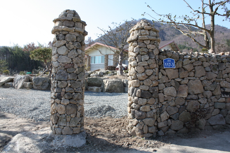 자신의 공간을 모두 돌로 만들고자 하는 이들 부부의 욕심은 갈수록 커져만 갔다. 대문 기둥도 돌기둥으로 만들었다. 딱딱한 돌의 느낌을 없애기 위해 대문 기둥을 원형으로 처리해 주변과 조화를 이루게 했다.