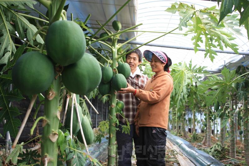 북평면 평암리 김성국씨 농장에는 중미와 남미, 동남아 등지에서나 볼 수 있는 짙은 녹색 과일인 파파야가 600평 시설하우스에서 자라고 있다.