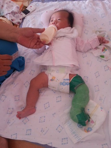 왼쪽 다리의 방향이 틀어진 선천성 만곡족이라는 병을 안은 채로 태어난 태민이의 다리는 세상에 나온 순간부터 무거운 석고붕대에 감겨야 했다. 바깥쪽으로 틀어진 다리를 교정하기 위해. 지난달 28일 태민이는 전남대학교병원에서 아킬레스건 연장수술을 받았다. 태어난지 한달여 지난 태민이가 견디기에는 너무 힘든 수술이었다.