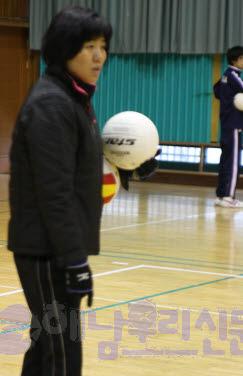 현역시절 가장 완벽한 기본기와 스피드로 당대 플레이어로 손꼽혔던 장윤희(41·전 여자배구 국가대표)씨가 청소년 여자배구 국가대표 후보(상비군) 18명과 함께 해남을 찾아 전지훈련을 하고 있다.<사진>