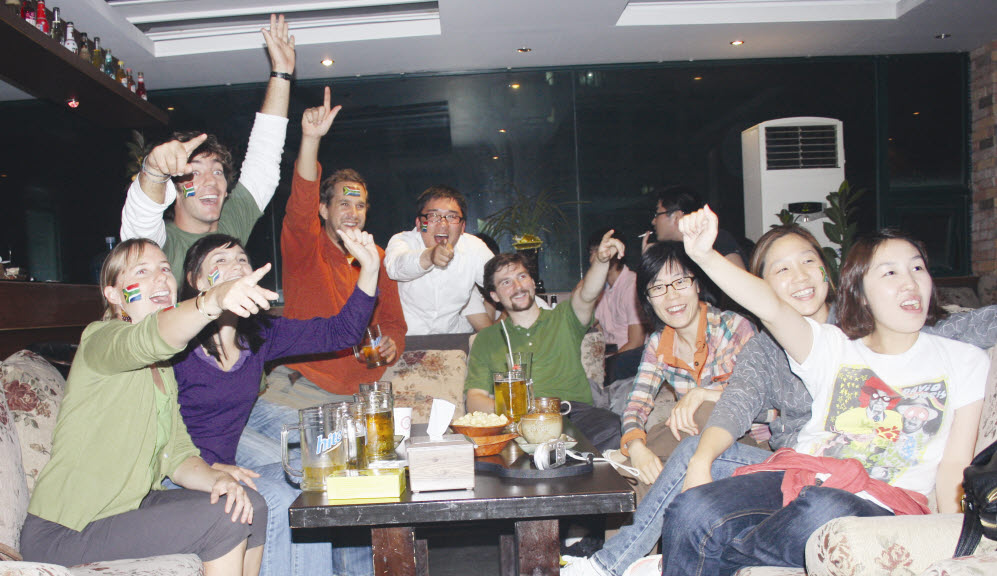 이들은 바로 2010 월드컵 개최국인 남아공에서 온 원어민 강사들이었다. 이날 응원은 해남고등학교에서 원어민 강사로 있는 마크 앤드류 웨츠(30·mark andrew watts, 이하 마크)와 황산초 원어민 강사인 크리스티너 조우베트(30·christine joubert, 이하 티너)가 주선한 자리였다. 마크와 티너는 연인사이로 남아공 포트 엘리자베스 출신이다. 마크와 티너는 해남에 온 지 2개월밖에 되지 않았지만 자국인 남아공을 응원하기 위해 인근 지역에 있는 친구 안리와 디제이, 데이비드(미국 출신) 등을 불러 대~한민국 리듬에 맞춰 대~남아공을 외쳤다. 여기에 해남에서 만난 친구들도 함께 모여 남아공의 승리를 염원했다.