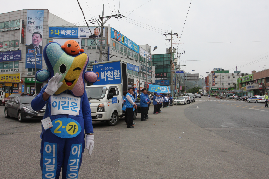 얼굴은 웃고 있지만 2014-06-05 해남우리신문 선거 막바지에 이른 더위가 계속되면서 캐릭터 옷을 입는 선거운동원들의 고생은 이만전만 아니었다. 캐릭터는 웃고 있지만 안에 있는 사람은 땀으로 온 몸을 적시는 등 고난의 행군이었다. 오죽하면 가족이 아니면 견디기 힘들 것이란 우스갯소리가 나왔을까. 김유성 기자/