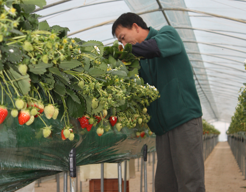 한겨울 싱그럽게 펼쳐진 파란 잎과 대조돼 빨갛게 매달린 딸기는 보는 이의 시각을 자극해 눈으로도 먹는 친환경 딸기이다.