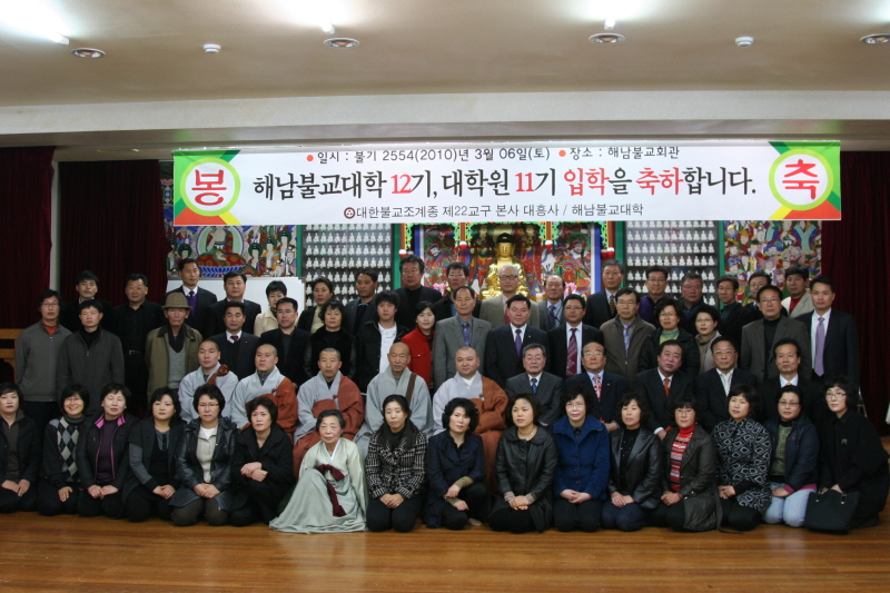 해남불교대학·대학원 입학식 2010-03-13 해남우리신문 불교대학 12기 대학생과 11기 대학원생 입학식이 지난 6일 한듬어린이집 2층에서 열렸다.이번 입학식에는 대학생 60명과 대학원생 25명, 대흥사 범각주지 스님이 참석해 서로간 입학을 축하했다.