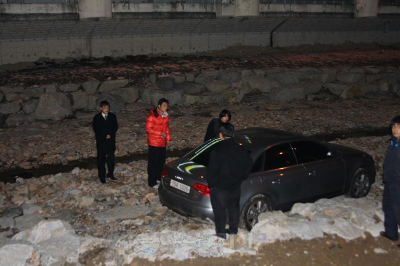 해남읍을 가로지르는 해남천 생태하천 복원사업이 한창인 가운데 천변교 인근 하천으로 아우디 차량 한 대가 추락하는 사고가 지난 8일 오후 6시에 발생했다.
